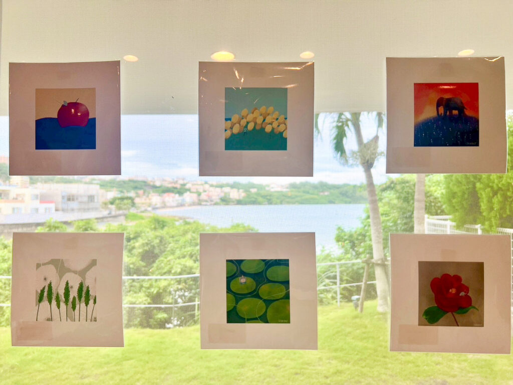沖縄で開催された試食会の会場に、アヤ子さんのデジタルパステルアート作品が展示され